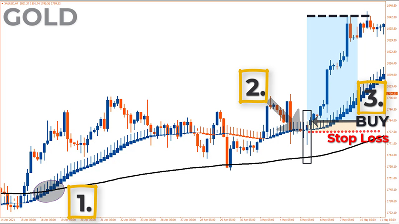 – Подождите, пока цена вернется к 20-периодному сглаженному Heiken Ashi.