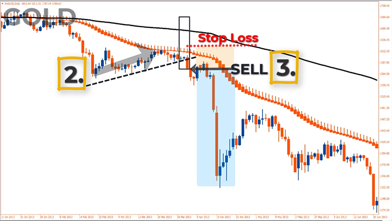 – 20-периодный сглаженный Heiken Ashi пересекает 200-кратную экспоненциальную скользящую среднюю вниз.