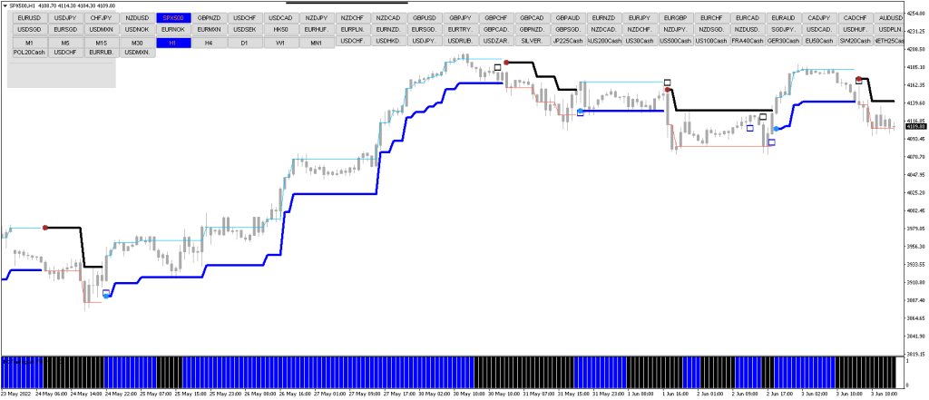 Нижний СИНИЙ/ЧЕРНЫЙ фильтр тренда-импульса индикатора является необязательным. Нижний индикатор должен дать вам представление о том, каких сигналов ожидать. Квадраты входа всегда будут соответствовать тренду, поэтому единственное, за чем вам нужно следить, — это входы (маленькие квадратики на графике).