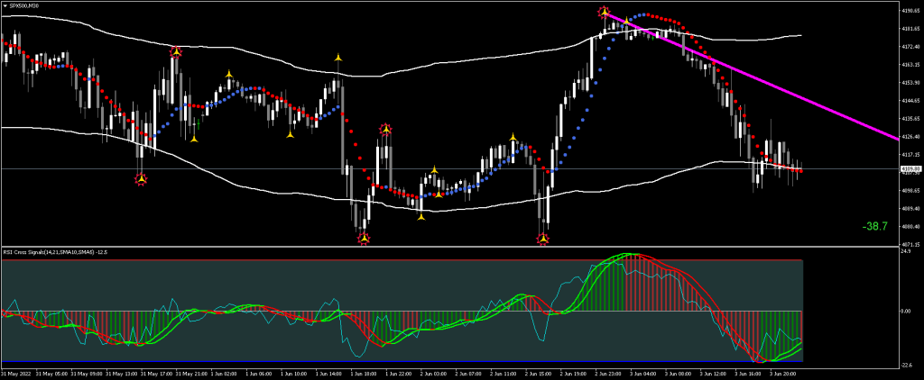 – RSI 21 период (синяя линия) пересекает сглаженные линии RSI сверху вниз, и на гистограмме RSI появляется красный бар.